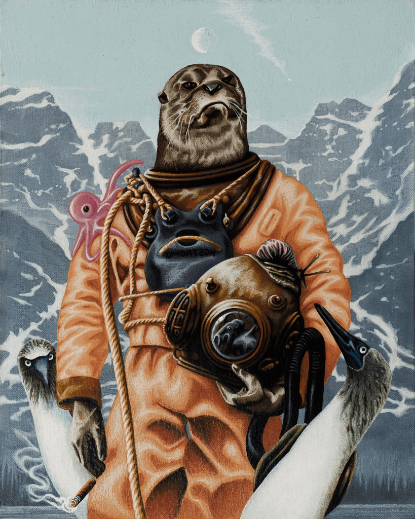 Julian Quaye produces striking anthropomorphic pieces featuring animals in reimaged human worlds. A particular pleasure in viewing Quaye’s work is that his portraits are both humorous but also packed with story. Each individual work stands alone while also feeding into a wider narrative arc of a shared and complex world. He added to this ongoing story in 2020.