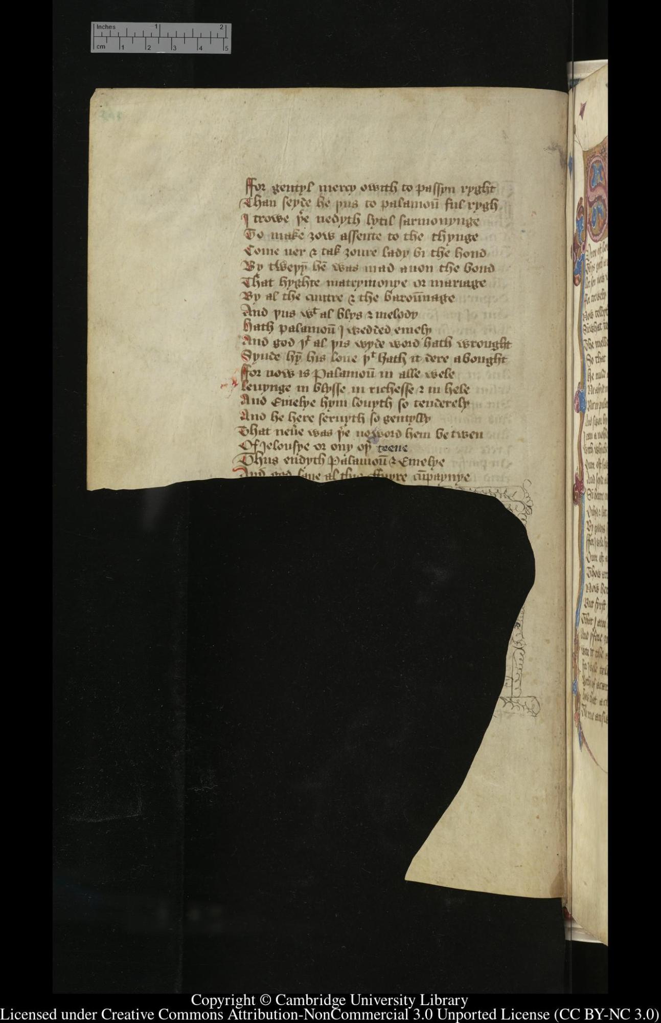 Fig. 3. Medieval manuscripts like this early copy of Chaucer’s works (Cambridge, Cambridge University Library, MS Gg.4.27.1, fol. 174v) sometimes had partial or entire pages featuring rich decoration, illustration, or illumination cut out by later owners or booksellers. Here, one of the portraits of Chaucer’s pilgrims has been excised. Reproduced by kind permission of the Syndics of Cambridge University Library. View the full manuscript at http://cudl.lib.cam.ac.uk/view/MS-GG-00004-00027-00001/1.