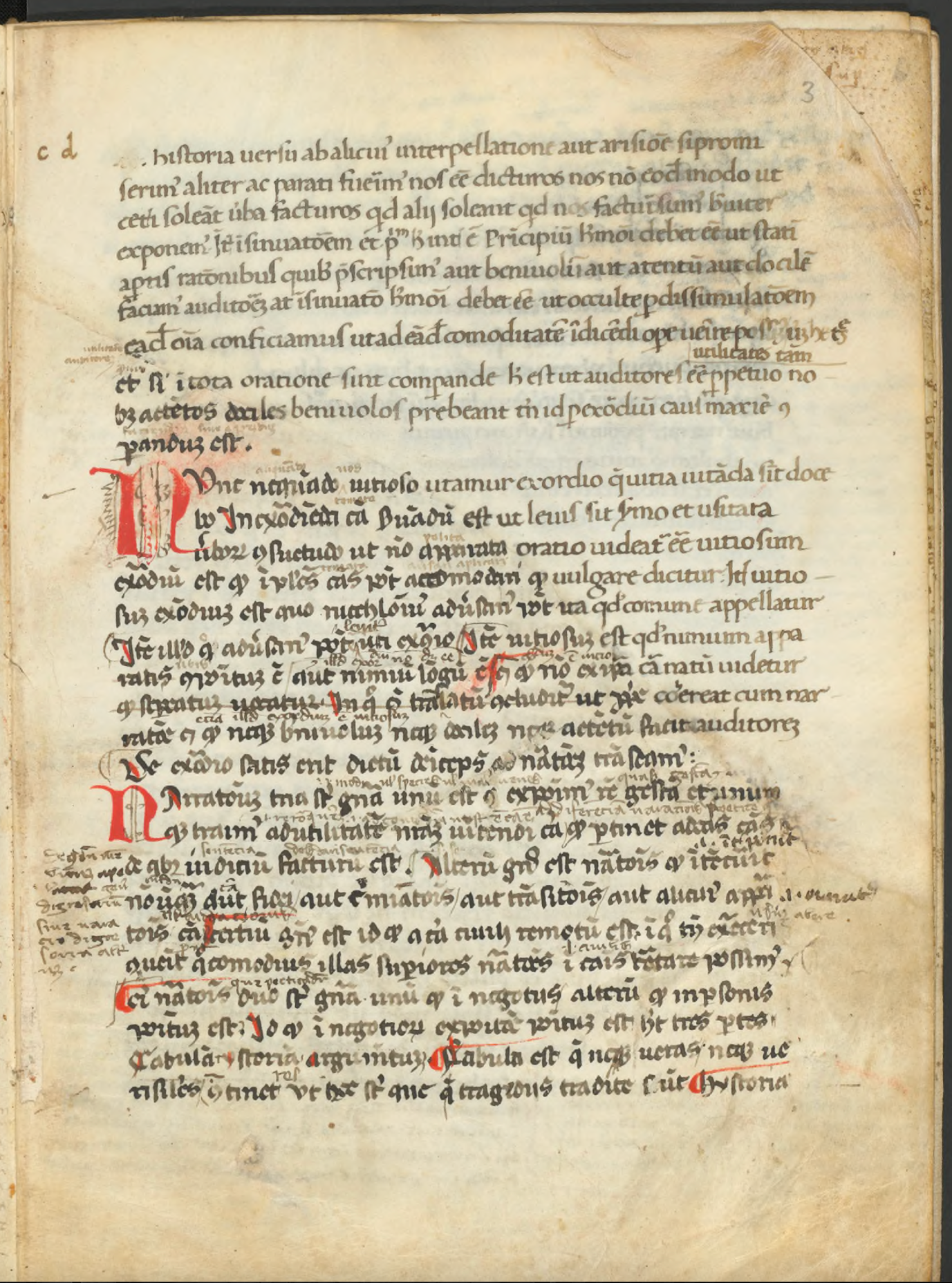 Fig. 2. A particularly well-loved, much-used manuscript copy of the late-antique, Pseudo-Ciceronian rhetorical treatise, the Rhetorica ad Herennium (Ithaca, Division of Rare and Manuscript Collections, Cornell University Library, Misc. Bd. Ms. 145, fol. 3r). Note the careful post-medieval repairs made along the diagonal, with text from the previously missing or damaged portion of the leaf (upper righthand corner) meticulously supplied in a different (Renaissance humanist) script. Courtesy of the Hathi Trust and the Cornell University Library. View the full manuscript at https://hdl.handle.net/2027/coo.31924098996089.