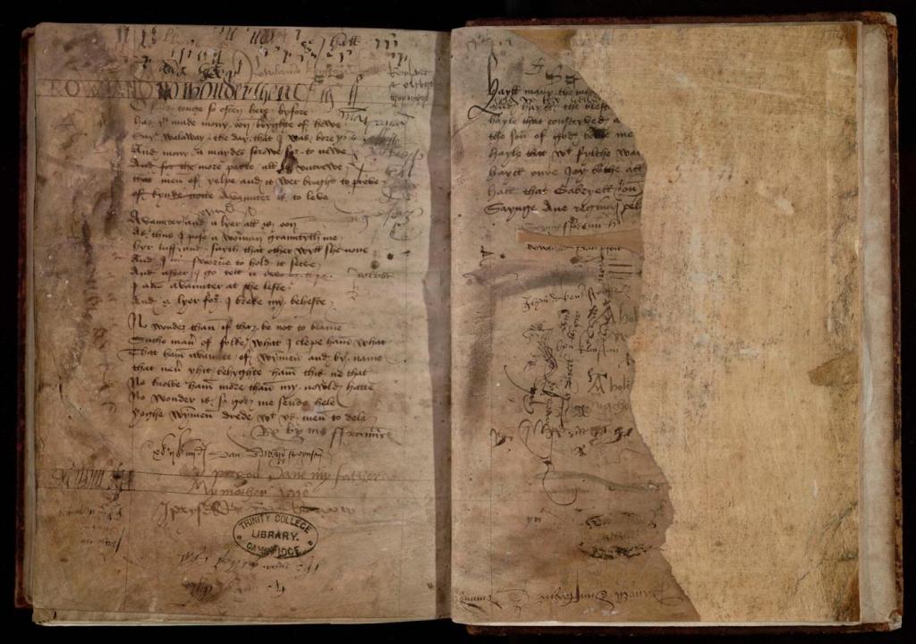 Fig. 4. A treasure trove for the book historian: marginalia, scribbles, and readers’ marks in the endleaves of a fifteenth-century manuscript containing the popular medieval travel narrative Mandeville’s Travels and John Lydgate’s historical poem, The Siege of Thebes (Cambridge, Trinity College, MS R.4.20). Reproduced by permission of the Master and Fellows of Trinity College, Cambridge. View the full manuscript at https://mss-cat.trin.cam.ac.uk/manuscripts/uv/view.php?n=R.4.20#?c=0&m=0&s=0&cv=0&xywh=-1146%2C-1%2C4793%2C3227.