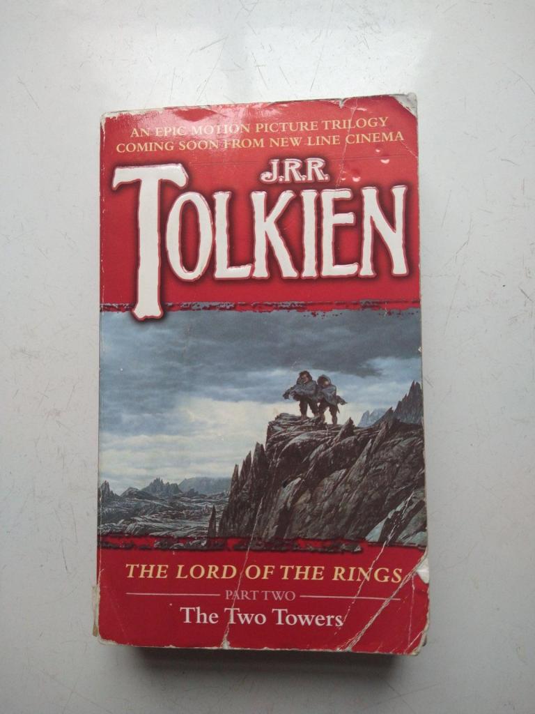 Fig. 5. Side by side: cover art on mass market paperback editions of Tolkien’s The Two Towers from The Lord of the Rings and his translations of three Middle English poems: Sir Gawain and the Green Knight, Pearl, and Sir Orfeo. Photographs are my own.