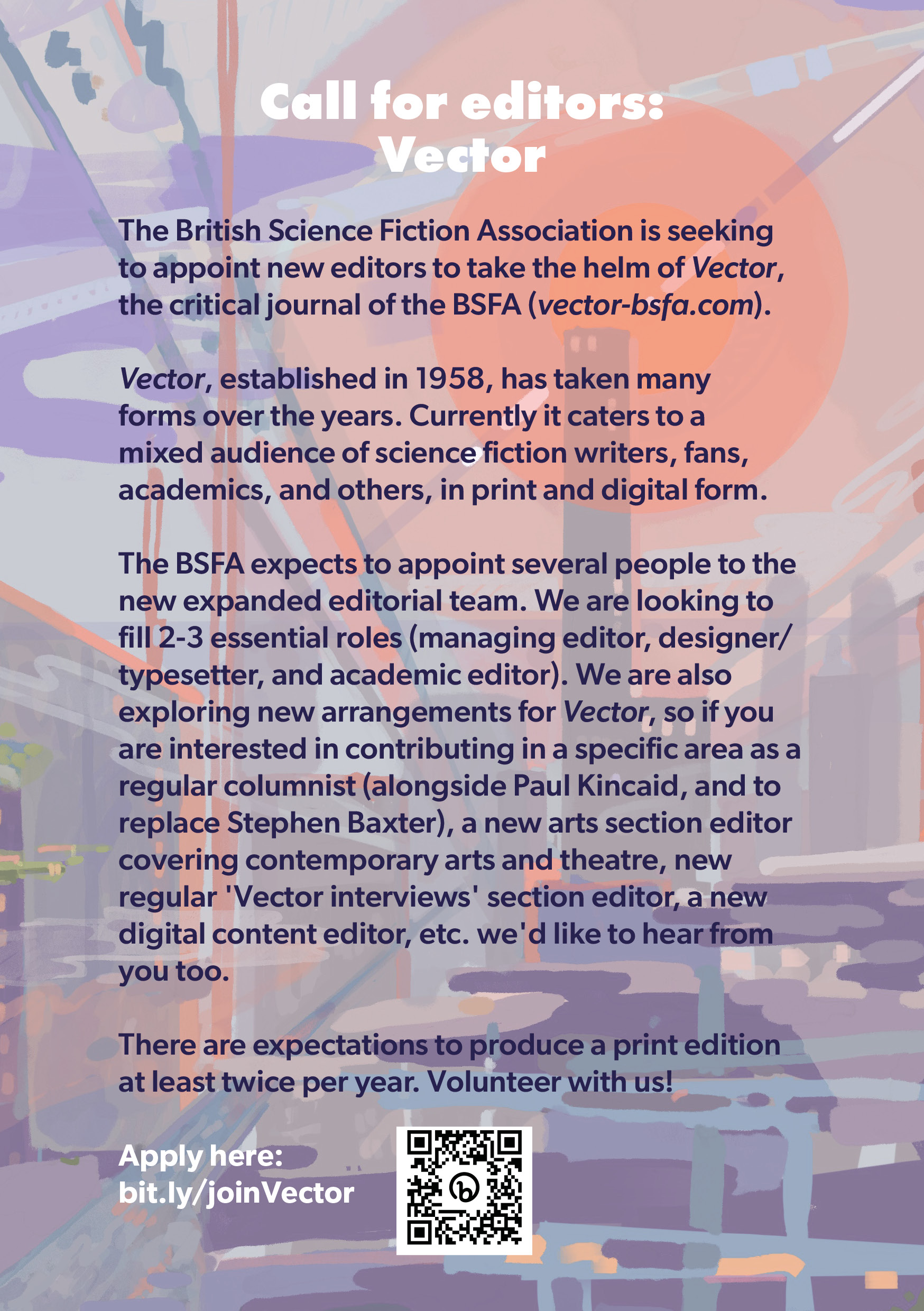 We are also exploring new arrangements for Vector. For example, if you’re interested in contributing as a regular columnist (alongside Paul Kincaid, and to replace Stephen Baxter), a new arts section editor covering contemporary arts and theatre, a new games review editor, a new film reviews editor, a new interviews editor, and/or a new digital content editor, and/or have ideas for another role, we’d like to hear from you too.