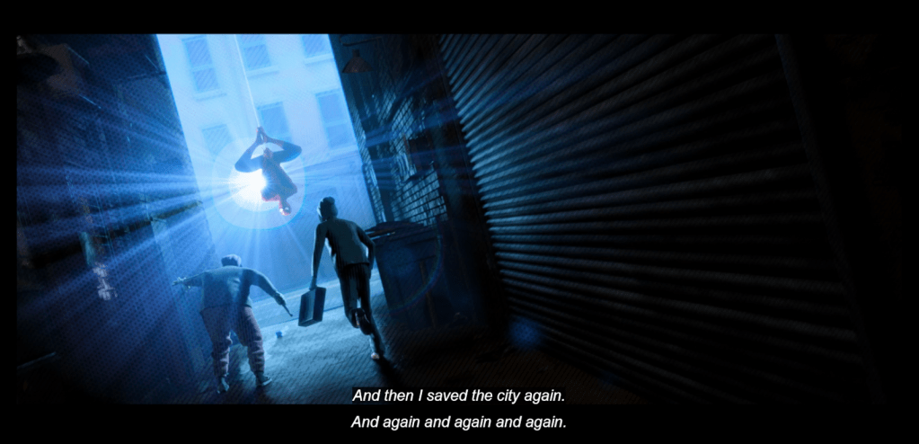 It’s this closed thinking the opening of the film acknowledges. The white male character of Peter Parker (Chris Pine) says, “For ten years, I have been the one, and only, Spider-Man.” He repeats it, saying “the only thing standing between this city and oblivion, is me. And I’m the only Spider-Man.” This notion of there being only one is of course in the popular history of Spider-Man comics, movies, TV shows, and products. Despite the retroactive continuity shifts that are normalised in comics, and the actual variations to Spider-Man in the comics and games, it is this notion that has travelled the furthest. This was the starting point for many in the audience of the film, including me. But, unlike some, I was one of the many who was open to and even yearning for there to be more. The opening design of the film guided all of us to multiplicity.