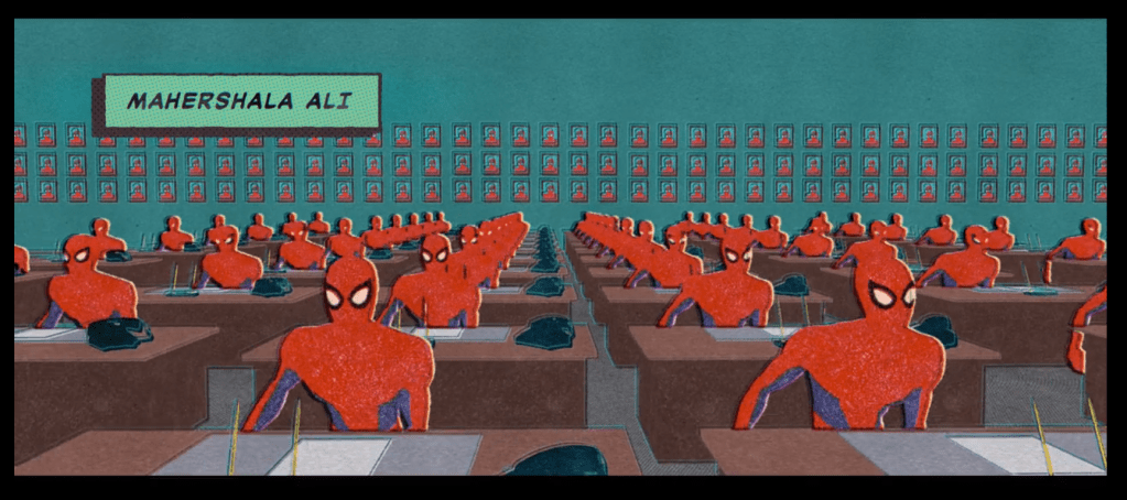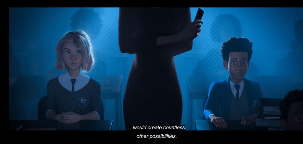 The screenwriters also prepare the audience for the dimensional storyline and the co-presence of multiple Spider-People, with multiplicity and possibility dialogue seeded throughout the first ten minutes and onwards. For instance, a journalist in the background mentions “multiple seismic events.” There is a class, where “parallel universes” are discussed, along with the idea that “time is relative.” It is also threaded through character dialogue about family members who “had a choice,” and joking to the son about how “you don’t have a choice,” and the son, Miles, repeating the play with “I choose to.” This kind of language is part of the greater superhero and individualist narrative, and is a device writers employ more generally, but with all of these other elements it aids in bringing potentiality to the table. Unlike Thatcher’s, Chatman’s, and Cheney’s overinvestment in a single course of action, Miles, and us, are being encouraged to consider more. It’s a word cloud drifting through us and setting the scene for what Ben Shaul describes as ‘the pleasurable arousal of viable optional thinking.’