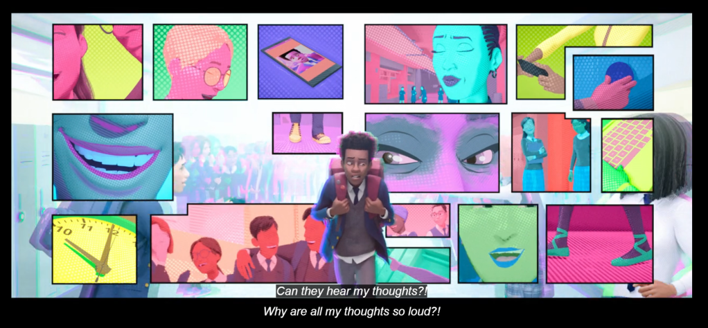 Spider-Man: Into the Spider-Verse fits what Ben Shaul says about a particular device, that of narrative alternatives to previous works of fiction. Distinct from an alternative history which can promote optional thinking by offering a different path in contrast to what happened in the actual world (I talk about this regarding Tarantino’s Once Upon a Time…, Dena, 2023), these alternatives are contrasted with the fictional world. Ben Shaul gives the example of Luis Buñuels’ film adaptation of Joseph Kessel’s novel Belle de Jour. In our context, it is the alternative to what is commonly associated with the fictional world of Spider-Man. There isn’t just one Spider-Man, now (and for those who were aware since 2011) there is (at least) Miles Morales (Shameik Moore) too! In a world where Spider-Man — through multiple visual appearance, actor, and storyline changes — has predominately been associated with one, white, boy, it breaks the rules.