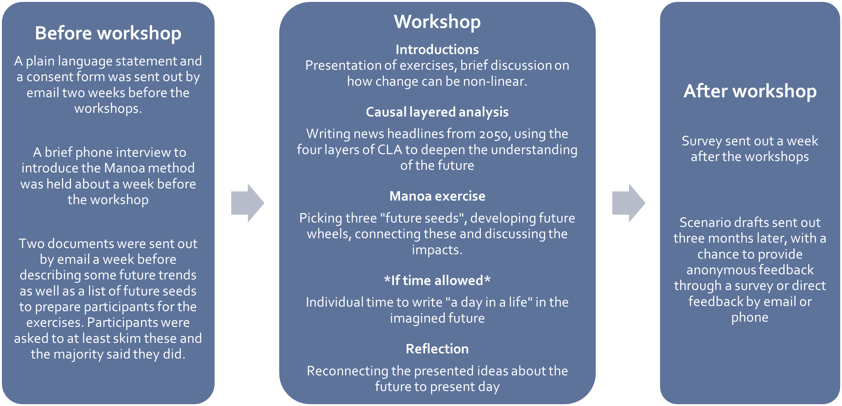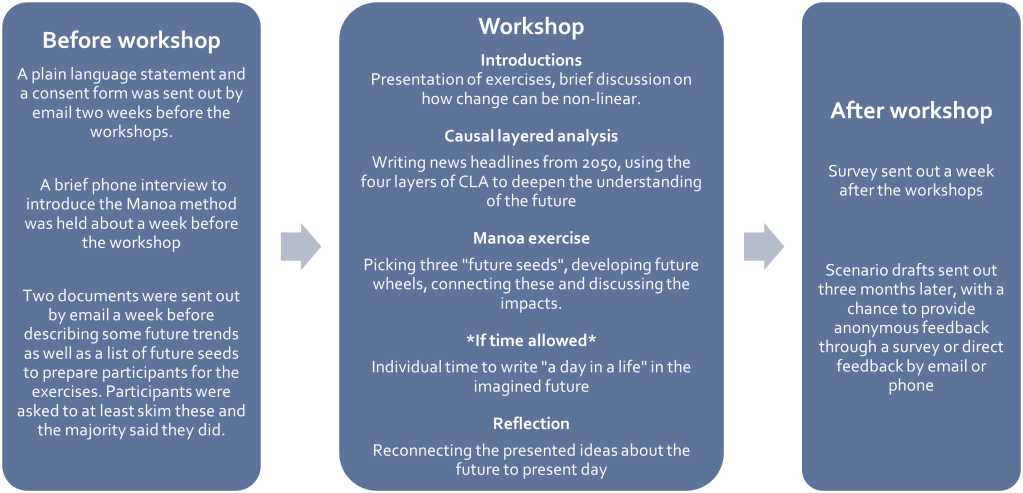 We combined CLA with the Manoa method, a scenario approach that enables creative and unexpected thinking about alternative futures (Curry and Schultz, 2009; Schultz, 2010). Both methods have been used in futures studies focused on sustainability issues before, (Heinonen et al., 2017; Falardeau, Raudsepp-Hearne and Bennett, 2019; Hamann et al., 2020; Raudsepp-Hearne et al., 2020) but to our knowledge they had never been combined to create this complementarity of an imagination-led approach and critical reflection.