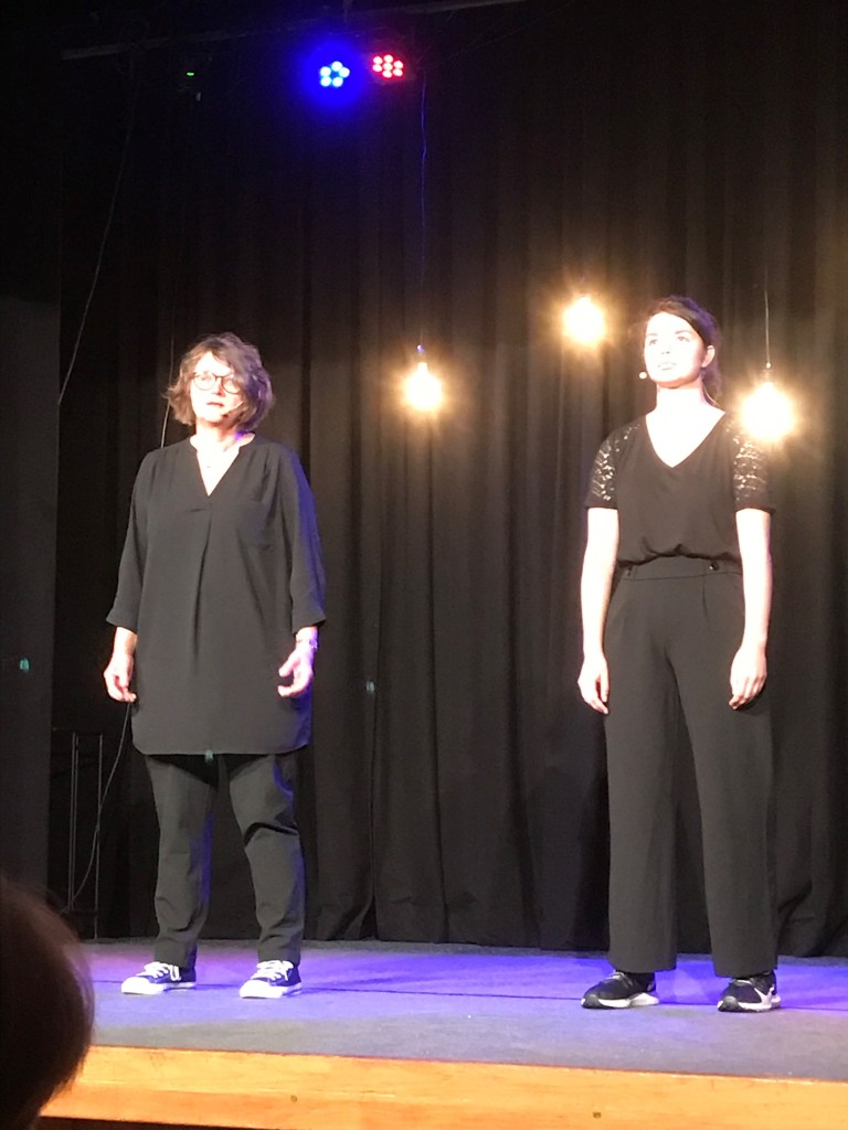 Figure 3 – Performance of scenario 3 – the two storytellers spoke in unison at first, then the stories diverged. The performance ended with one asking the other: “We do all of that, we’re able to turn things around?” and the other answer “I think so. But you should really ask them” as she turns to the audience.
