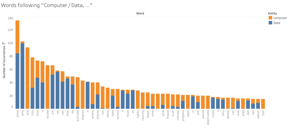 While the source of the computer’s analytic capabilities could be interpreted through either an exceedingly advanced technological lens or a dystopian lens of a data-underclass, Data is unambiguously portrayed as an autonomous being. The gap in physicality between the computer and Data becomes manifest in the way that other characters engage with them. Where the computer is treated as a service worker and utility, Data is regarded as a proper interlocutor, worthy of explanation, hypotheticals, and discussion. Comparing “Computer, …” to “Data, …” computationally is challenging, since they are not always used in identical ways. Not all utterances to Data begin with his name, which can also appear mid-sentence. Even with these caveats, we see distinctive patterns in what people request of these two entities. The computer – exclusively – is told to “end”, “halt”, “run”, and “resume” programs; “locate” people and things; “display”, “show”, “pause”, and “freeze” images; and “play” video. Without so much as a verb, people command “lights!” or ask “time?”. “Deactivate” and “activate” are also almost the sole purview of the computer, and the computer is commonly the agent told to “access” data. Most of these interactions are tied to the visible form of the computer: its screens and holograms, and its intermingling with the electronic nervous system of the ship. On occasion it is asked to identify something through the question “what” (quite often some form of, “what time is it?”), interrogated about a process with “how”, or asked to locate something with “where”, but “who” and “why” are rarely asked of the computer.