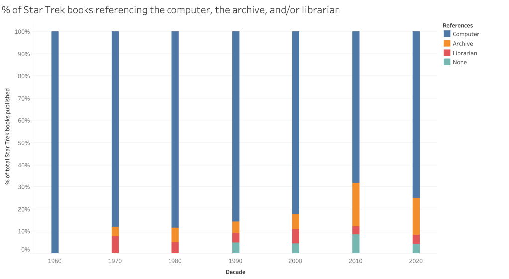 While there are relatively few librarians in Star Trek’s future, the universe is deeply saturated with information and information agents– most novels contain either an archive, a computer, a librarian, or some combination of them. Archives and librarians rarely appear in texts without computers. Archives appear in 10% of novels, twice as frequently as librarians. A thorough investigation of the depiction of these archives – what they contain, how they are managed, and how users interact with them – is outside the scope of this paper. While the Star Trek universe makes it easy to gloss over the differences between libraries and archives (e.g. one notes the similarities between Sato’s VR trip to the “Kanthropian database” library and numerous scenes involving “the archives”), “librarian” and “archivists” are distinct professional identities in our universe, and here we choose to focus on the former.