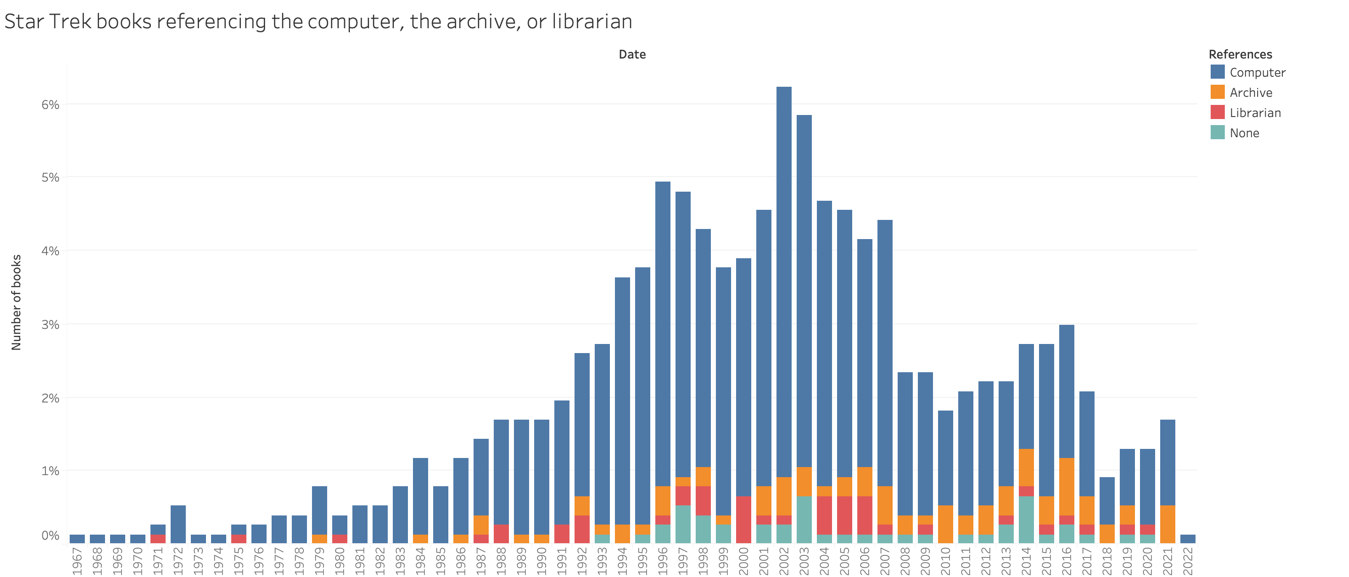 Fig. 1: Star Trek novels referencing the computer, the archive, and/or librarian, 1967-2022