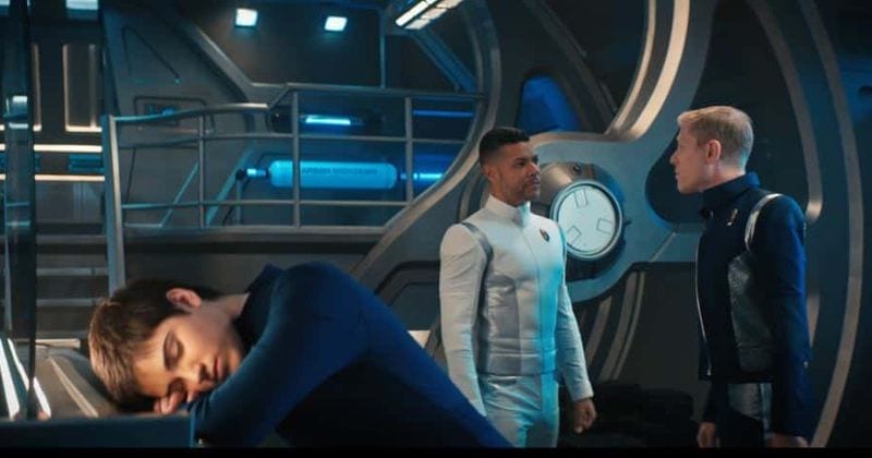 But the scene has a background as well as a foreground, in which Adira’s new colleagues / bosses / adoptive parents – Discovery’s doctor Hugh Culber and his partner, scientist Paul Stamets – talk softly and supportively. Not only are they honouring the work of a very young and new crew member, but – for the first time – using Adira’s chosen pronouns in conversation.